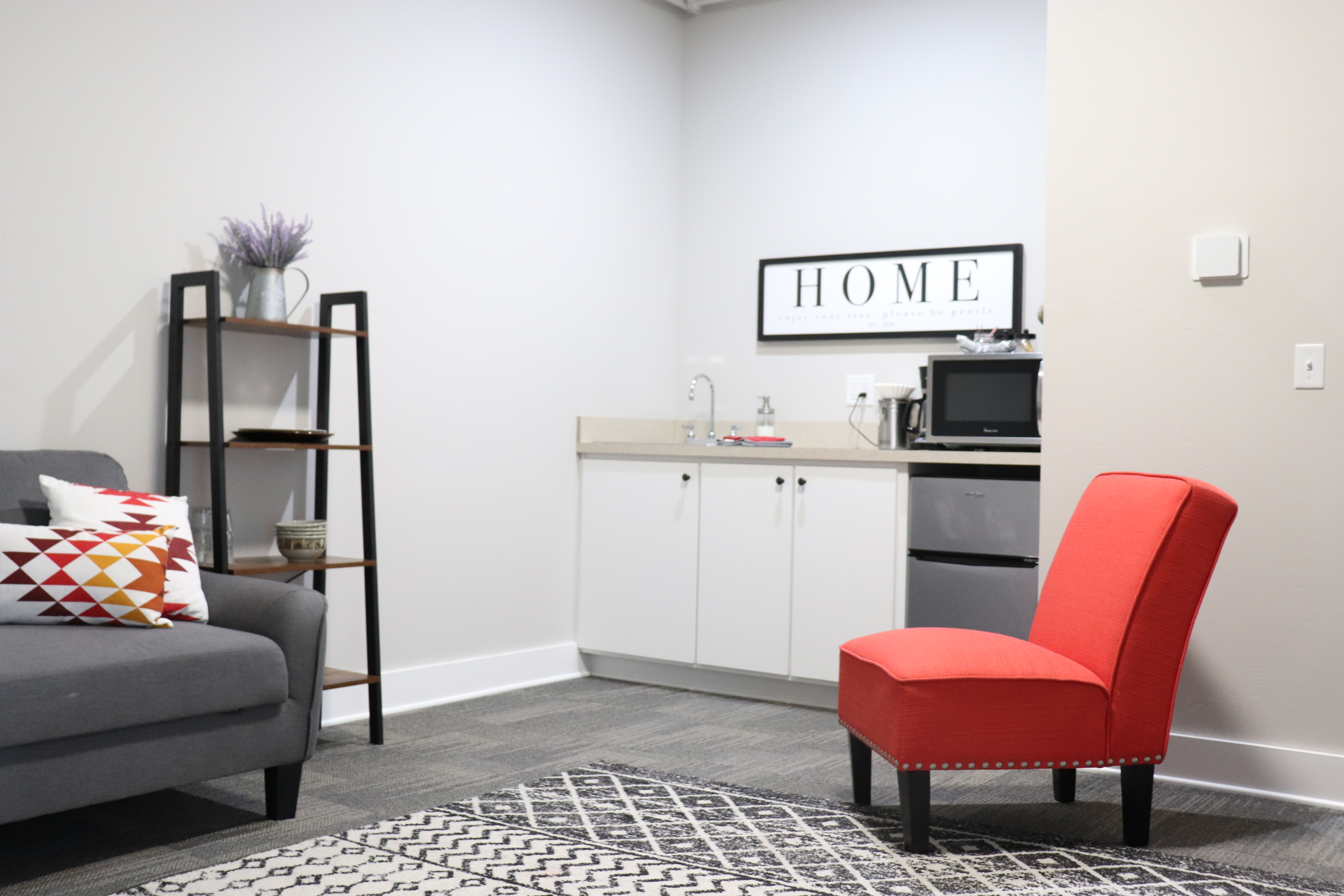 Guests have sole access to the entire private 750 SF Suite and also to the shared common area just down the hall. This area contains an additional breakfast bar, a large gathering table, and a lounging area.
