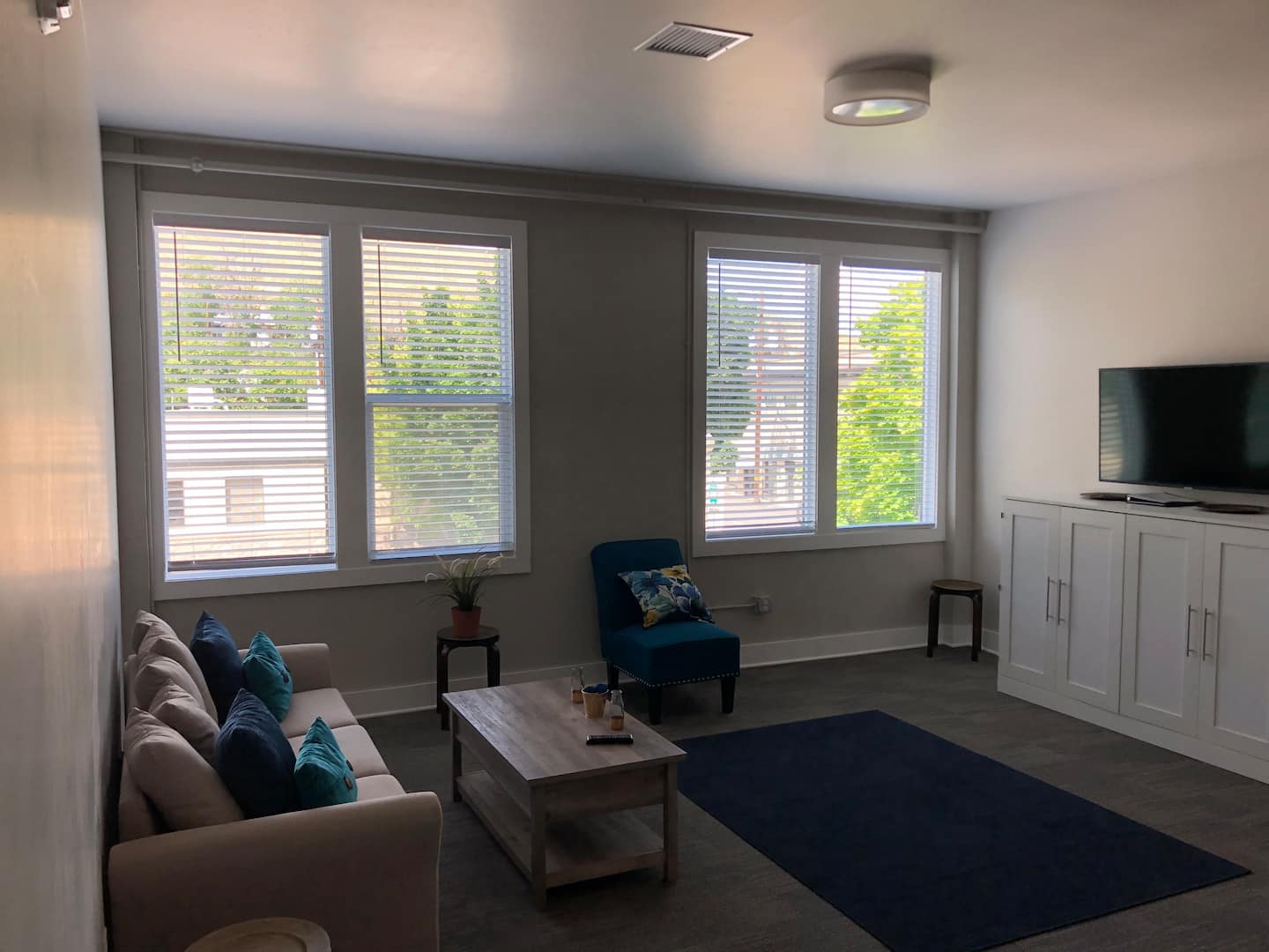 The suite includes private bathrooms and a breakfast bar, a living room, and two bedrooms. The television is for streaming from the guest’s personal device as there is no cable. The Building has fiber-supplied Wi-Fi. This space does not allow for cooking. The newly renovated building is ADA accessible.