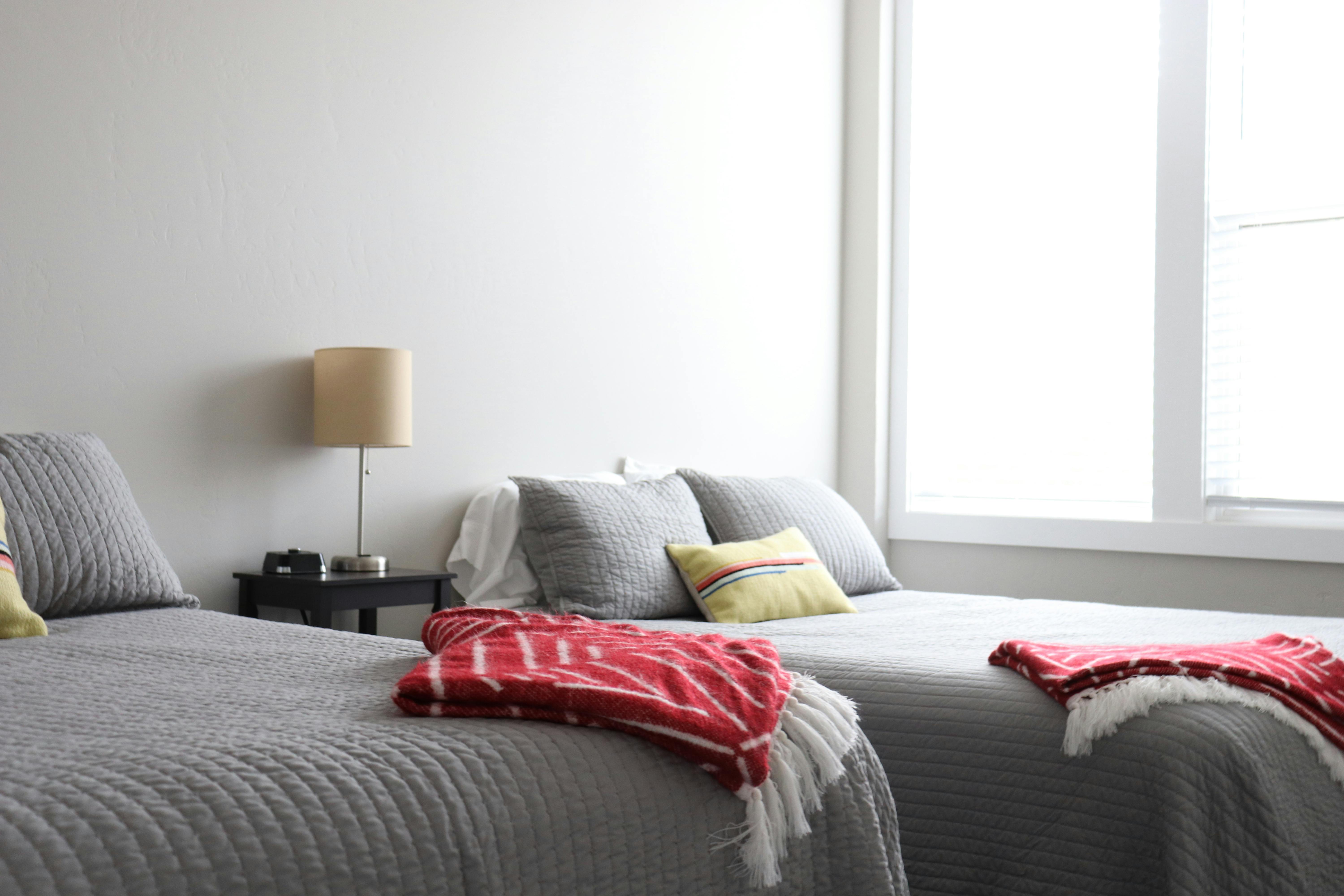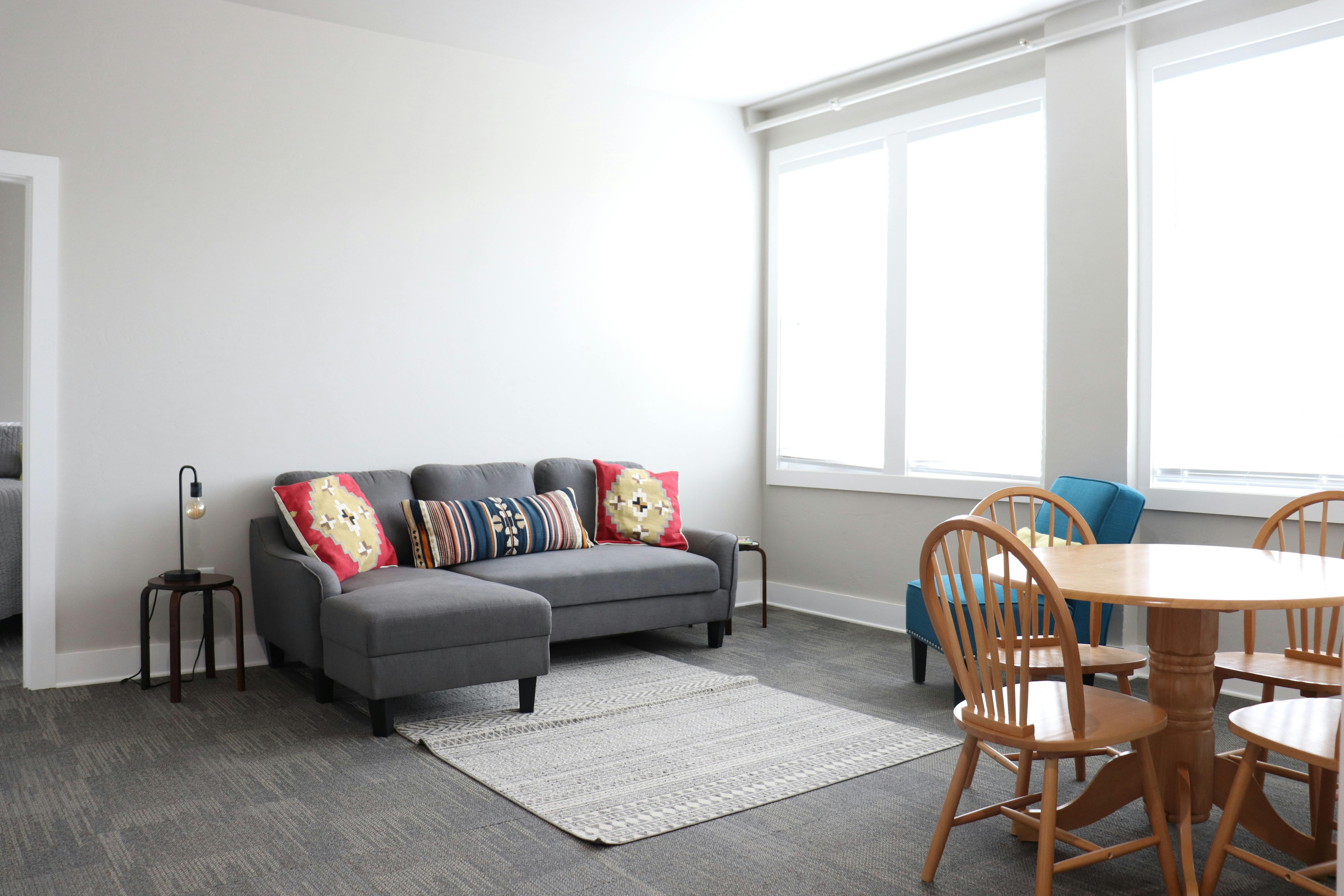The suite includes private bathrooms and a breakfast bar, a living room, and two bedrooms. The television is for streaming from the guest’s personal device as there is no cable. The Building has fiber-supplied Wi-Fi. This space does not allow for cooking. The newly renovated building is ADA accessible!
