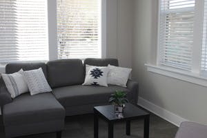 The suite includes private bathrooms and a breakfast bar, a living room, and two bedrooms. The television is for streaming from the guest’s personal device as there is no cable. The Building has fiber-supplied Wi-Fi. This space does not allow for cooking. The newly renovated building is ADA accessible.